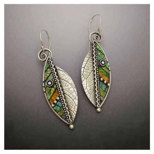 Long Hanging Abstract Iridescent Green Leaf Earrings Creative Zigzag Artificial Wood Leaves