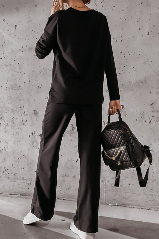 Round Neck Long Sleeve Top and Pocketed Pants Set