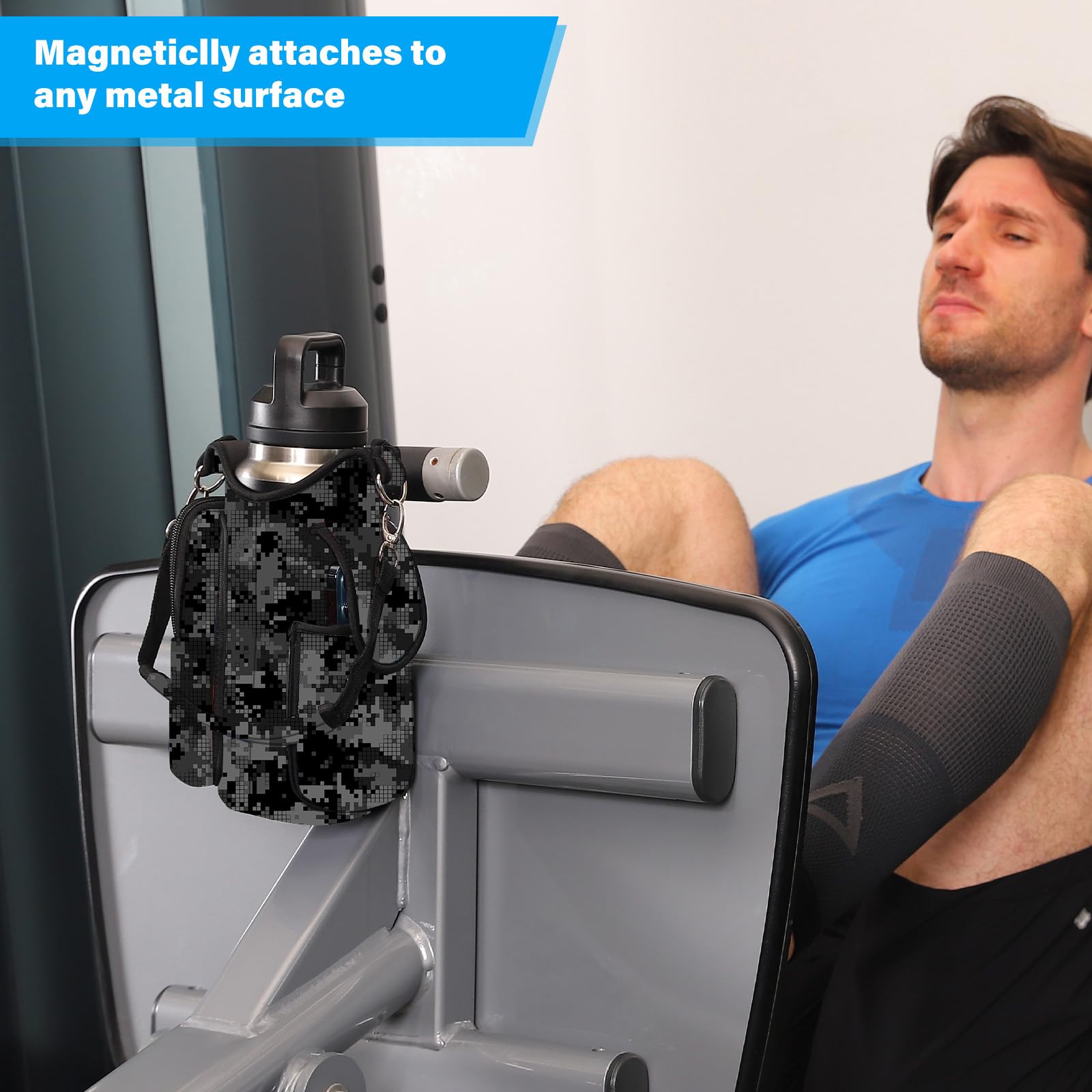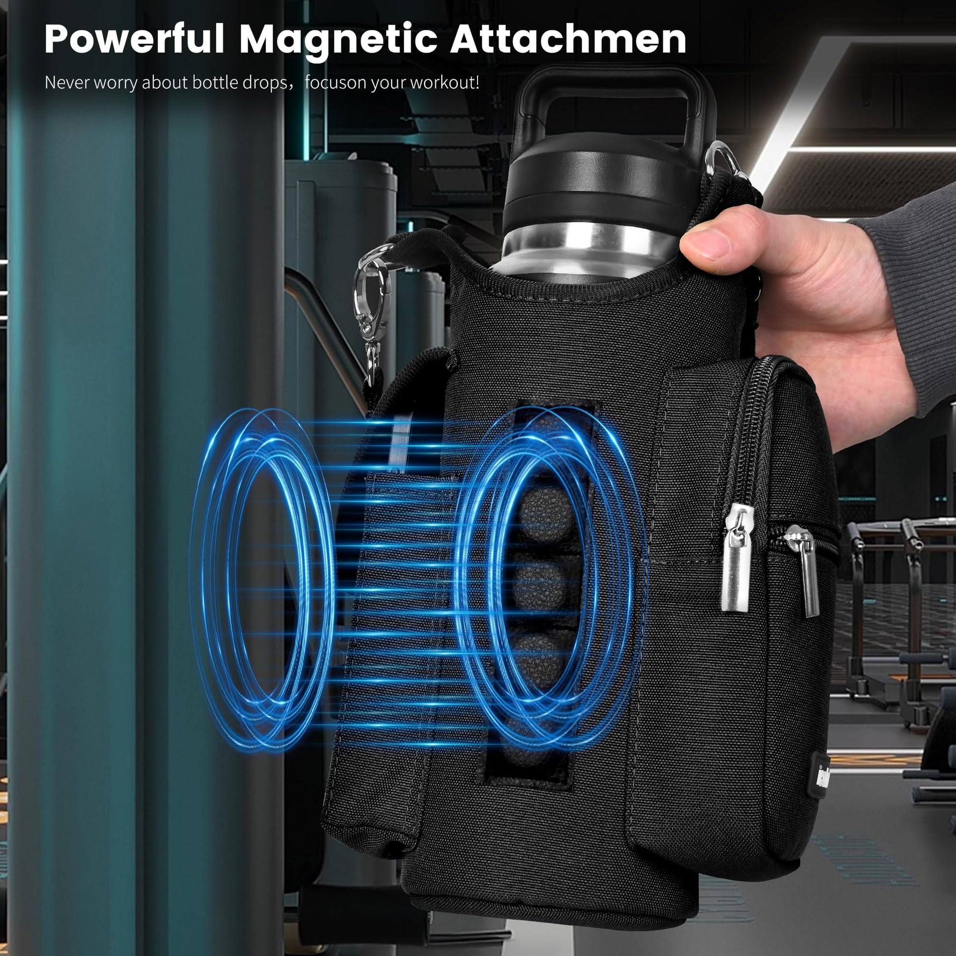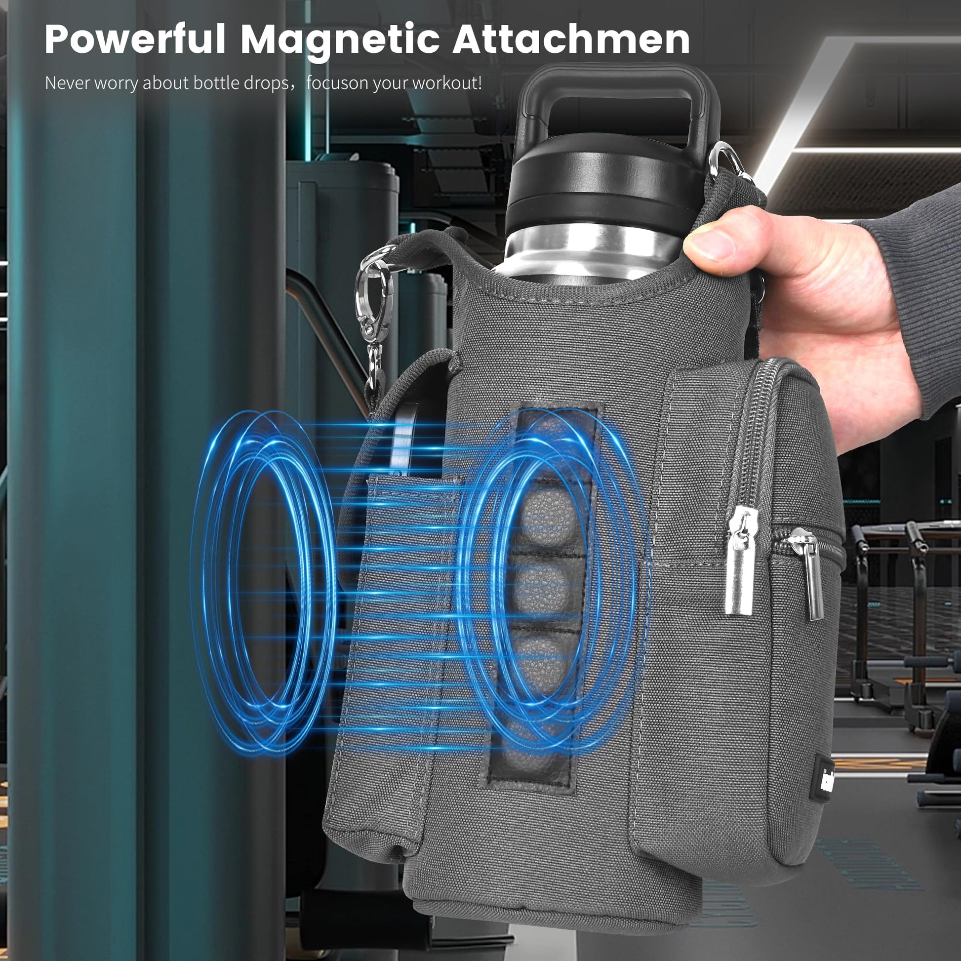 - (Product of Registration for a US Design) Powerful Magnetic Fastening: Equipped with 5 powerful Built-in magnets,our icolor Gym Magnetic Bag Gym Sports water bottle holder carrier,securely attaches to any metal surface,ensuring your bottle and personal items stay firmly in place.(Note:Water Bottle is not included)