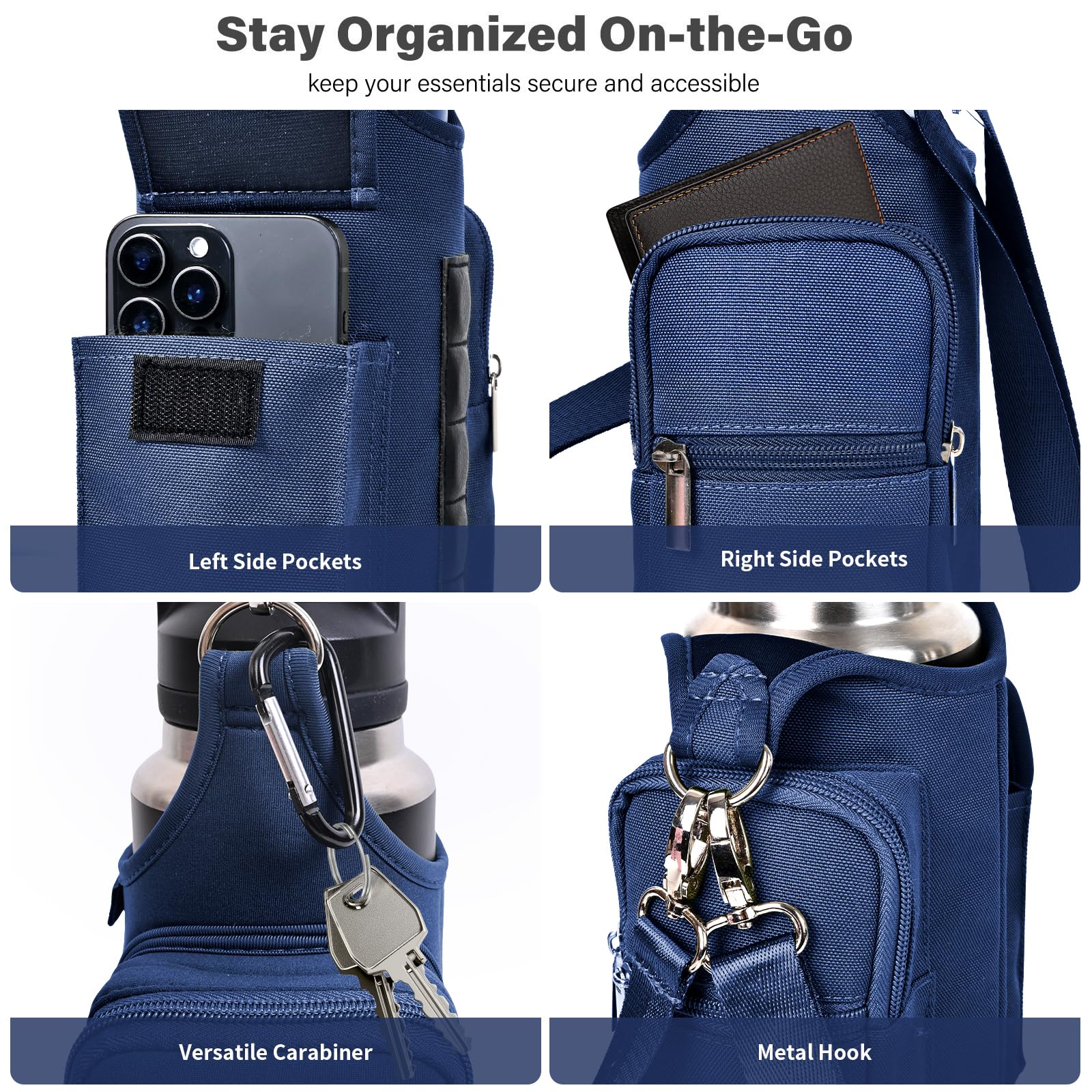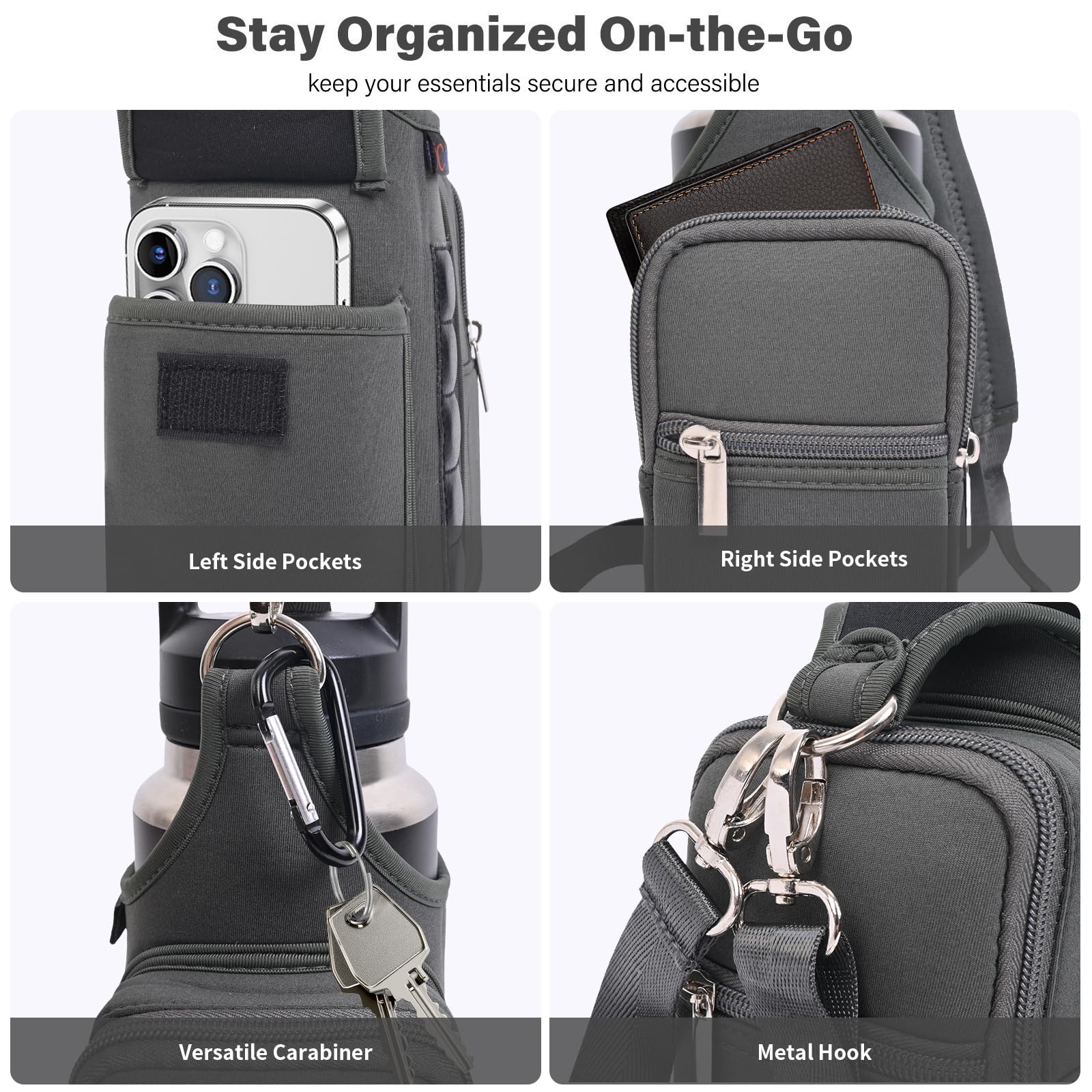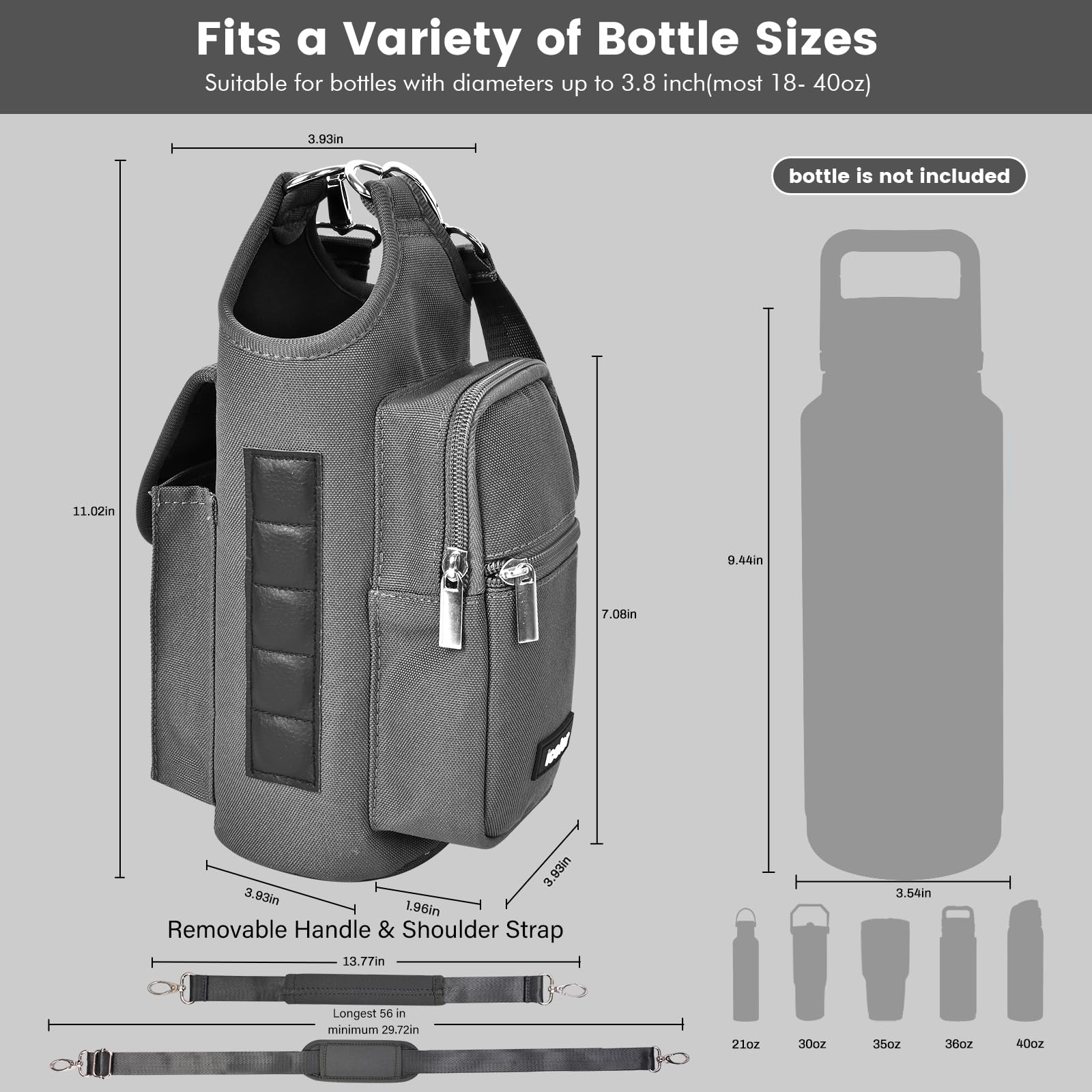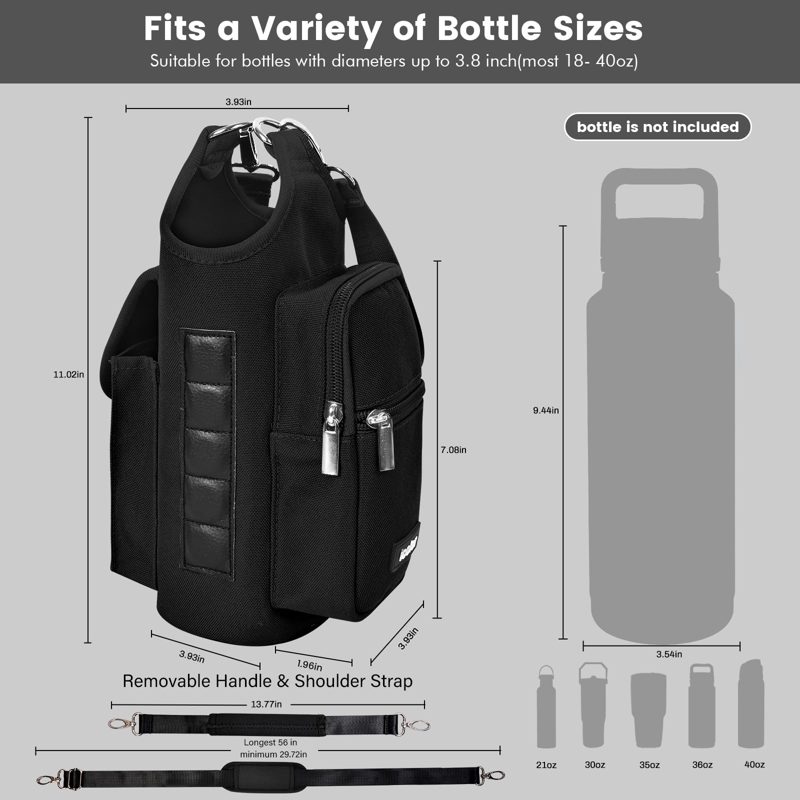 - Universal Fit & Practical: Designed to fit most standard water bottles up to 3.9" diameter, from 18oz to 40oz(500ml ~1300ml),Compatible Hydro Flask / YETI,the Phone Pocket Fits Large Phones as iPhone 16 /17 Pro Max/Samsung Ultra,Crafted from soft neoprene,sturdy yet lightweight,this gym water bottle holder bag offers a reliable solution for gym-goers seeking convenience and functionality.